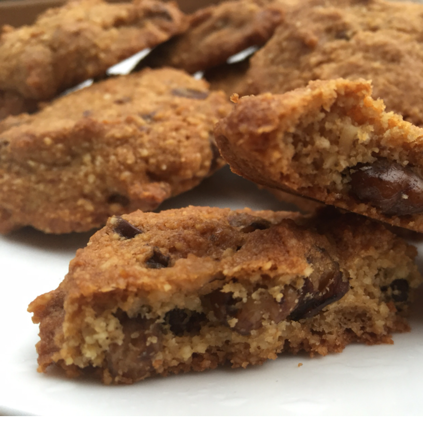 Preheat the oven to 350ºFCream together by hand or using a food processor the butter, sugar, maple syrup, vanilla and egg. Mix together the almond meal, coconut flour, baking soda and salt. Add dry ingredients to the wet and mix until just combined. Gently stir in the chocolate chips and nuts.