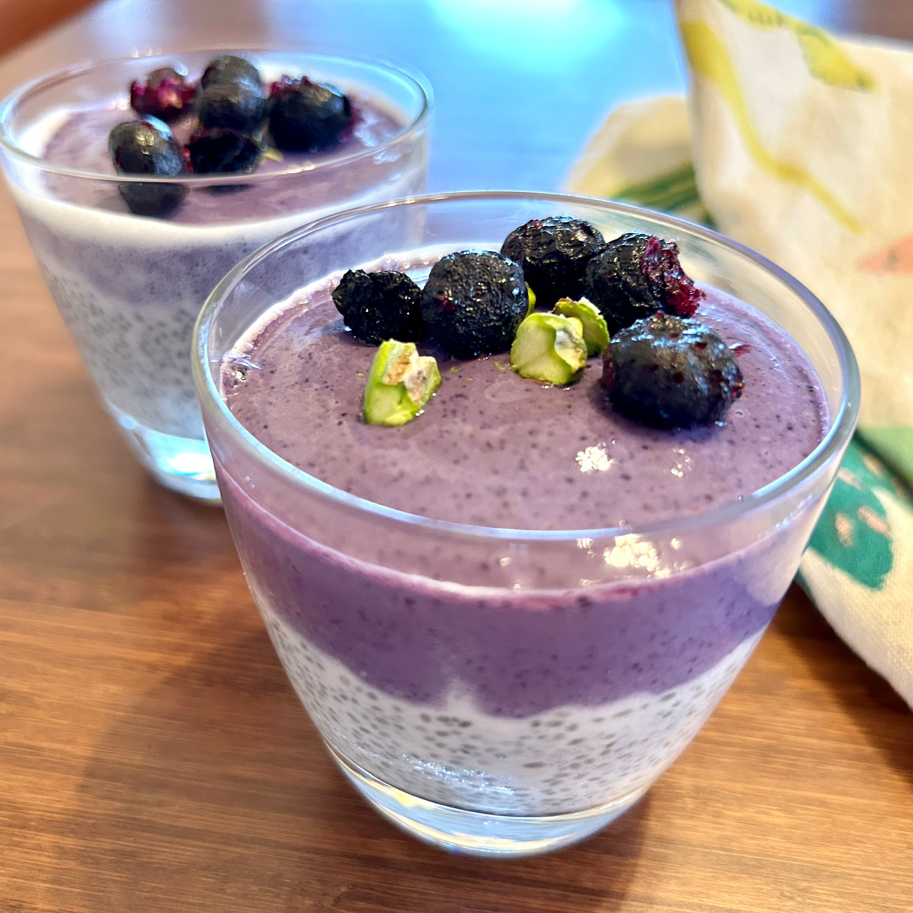 Fruit, and garnish of choice. - When ready to serve, I blended some blueberries in the leftover cashew milk and poured it on top of my chia pudding and garnished with dried blueberries and chopped pistachios.