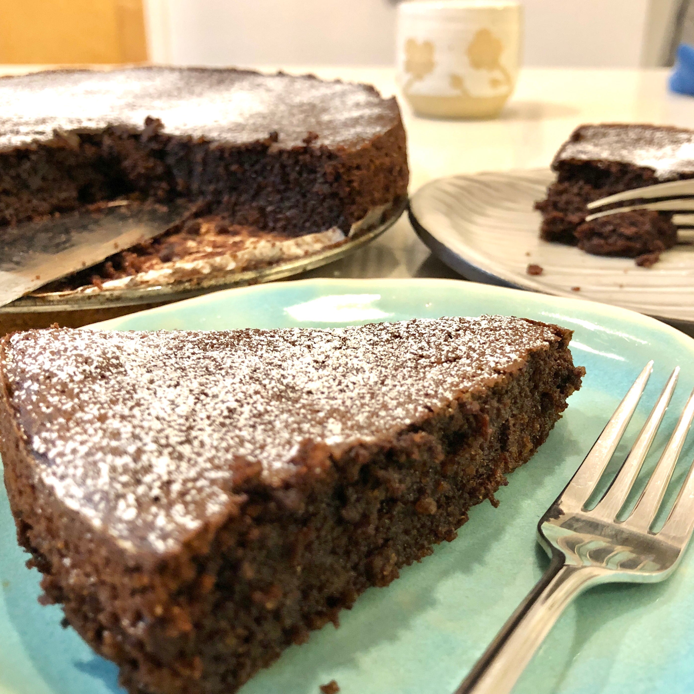 This recipe from Nigella Lawson is one of my favourite chocolate cakes, gluten free or not. It is dense and full of chocolate but also incredibly moist. As per usual I backed off a bit on the sugar from the original recipe, and also added our chocolate.