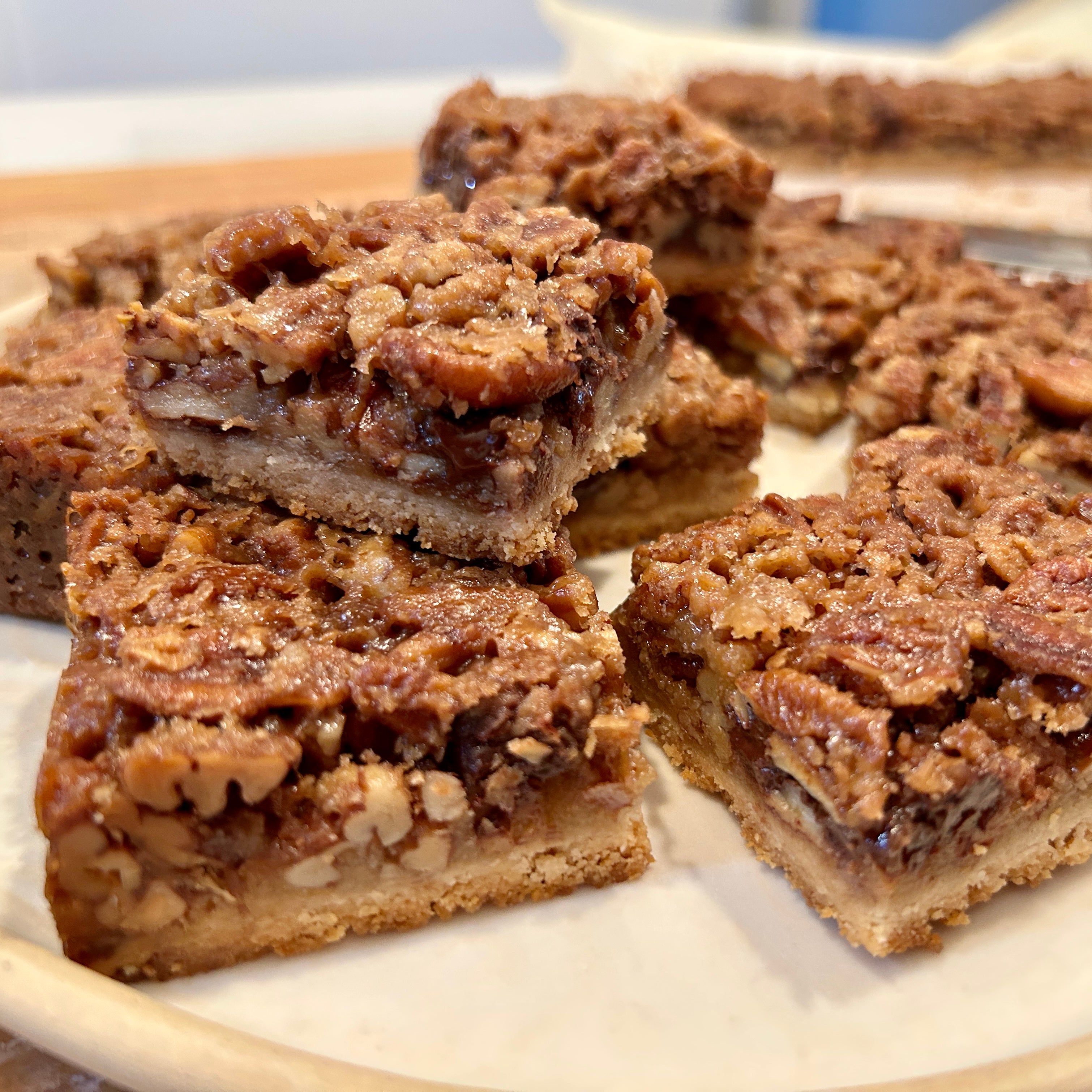 These pecan chocolate bars are adapted from the Minimalist Baker. Again, like many of our recipes, it comes together relatively quickly. While the crust is doing a bit of a pre-bake, the filling gets whipped up. I used a dairy free butter for the crust, which I honestly don't love. As our teen says, it tastes faintly of mushrooms, which is true! So if you use butter, go for it, if you have a fave butter substitute, use that.