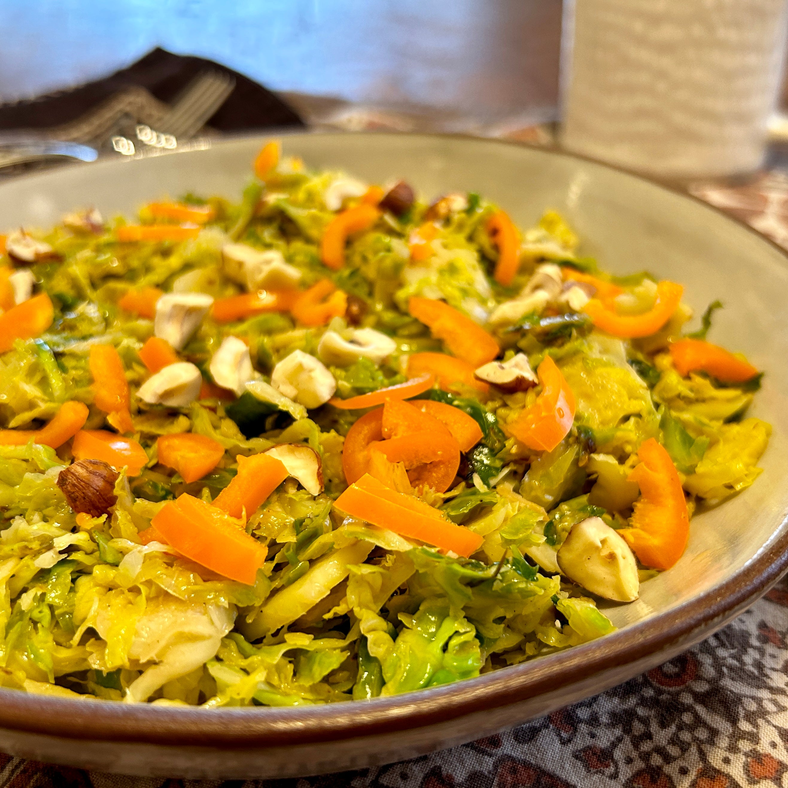- 1 pound brussels sprouts, washed, stems removed and chopped, sliced, diced or processed.