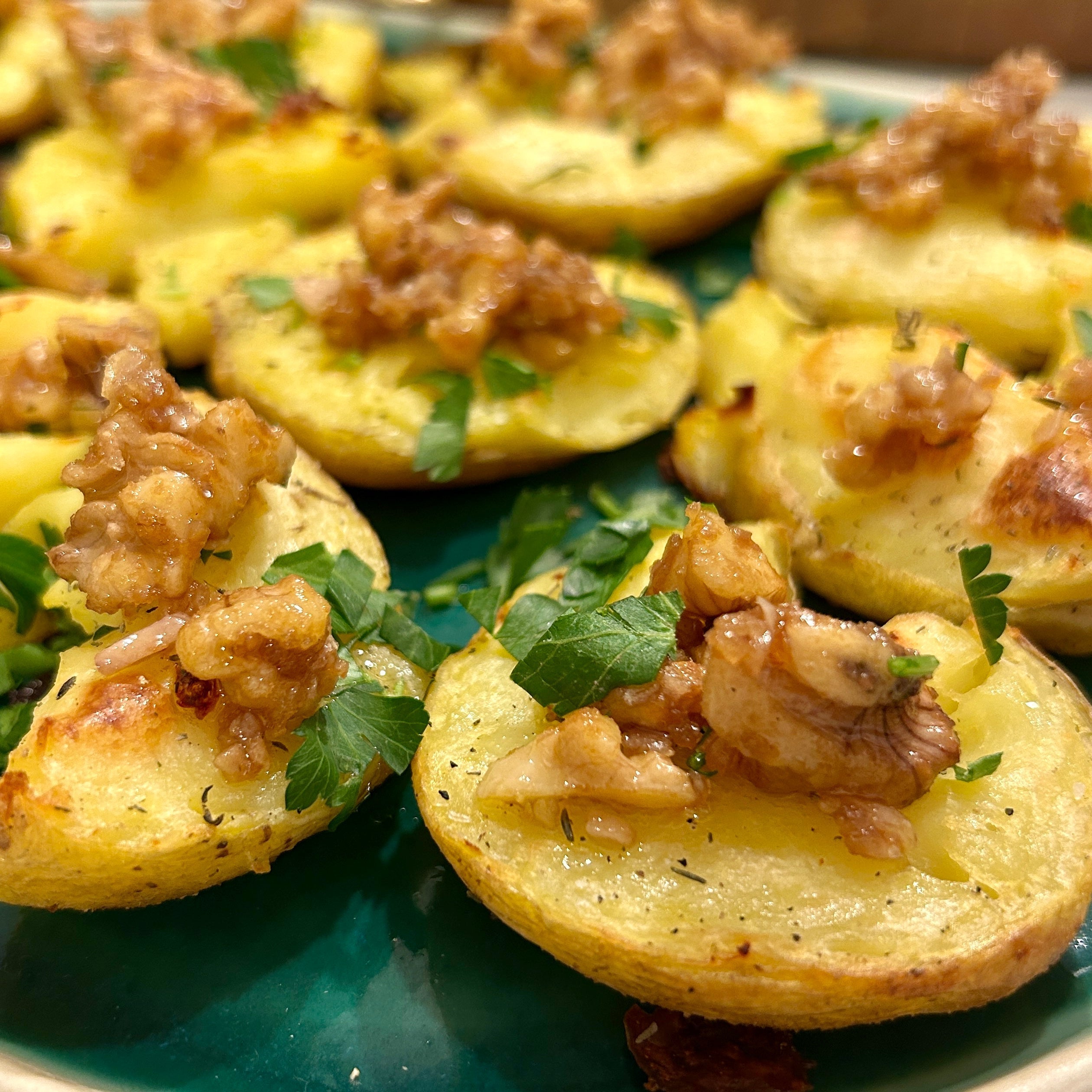 Top the potatoes with the walnut sauce and oil. Scatter fresh herbs over the potatoes.