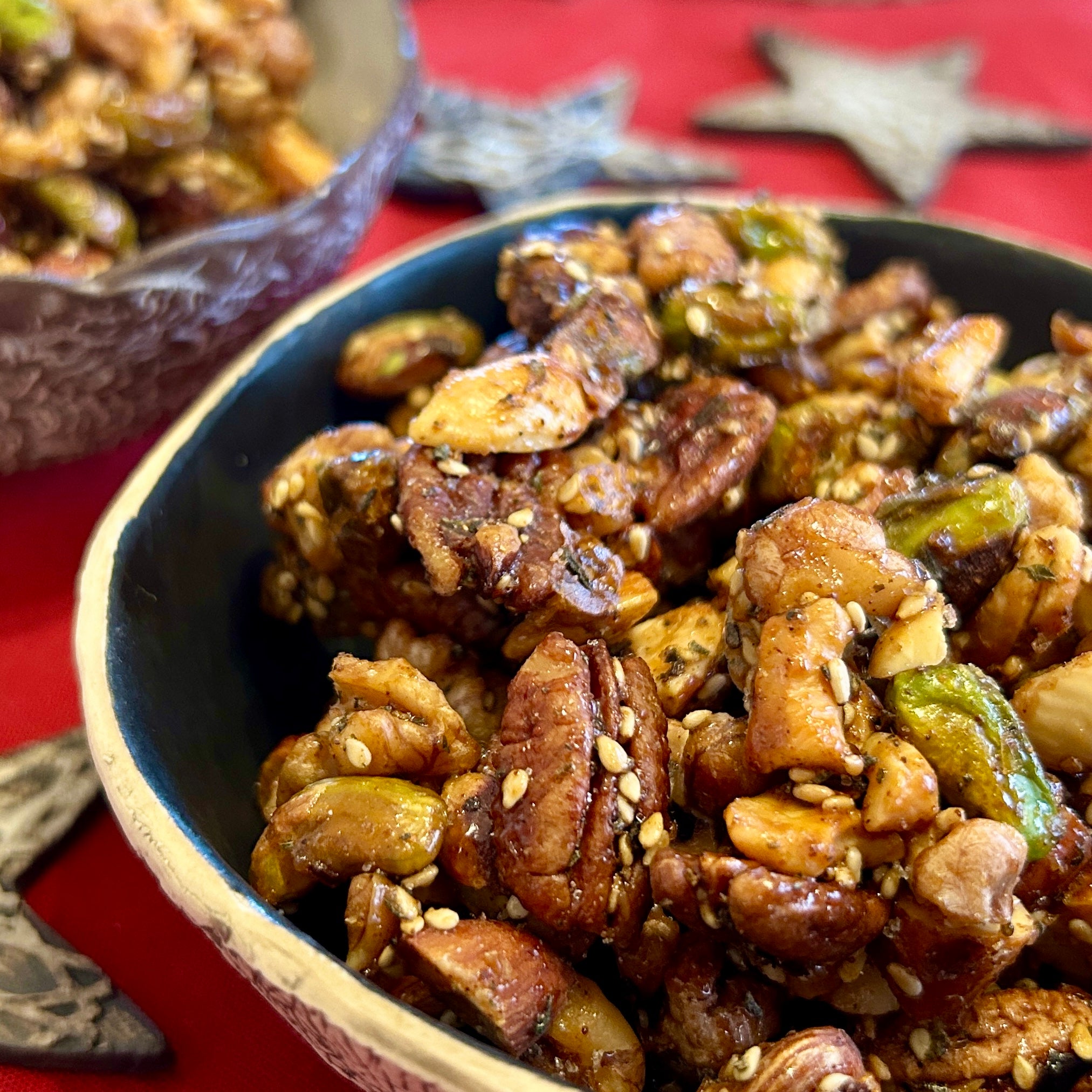 This recipe is a variation on one from food blogger Arianne Jones. It takes on a caramel like quality as it bakes and the sugars in the maple syrup start to bind the nuts together. You can use any variety of nuts or seeds. And, it makes a great gift if you put them up in nice jars with a cute label on them. The flavour of these spicy nuts really seems to increase by the second day, so watch out with the heat of it all. If you aren't good with lots of heat, I would strongly suggest you use just one teaspoon of crushed chilli peppers.